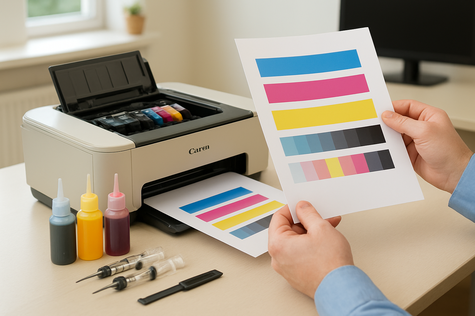 Nếu chất lượng in chưa đạt yêu cầu, thực hiện thêm 2-3 lần in thử. Mực mới đổ có thể cần thời gian để lưu thông đều trong hệ thống.