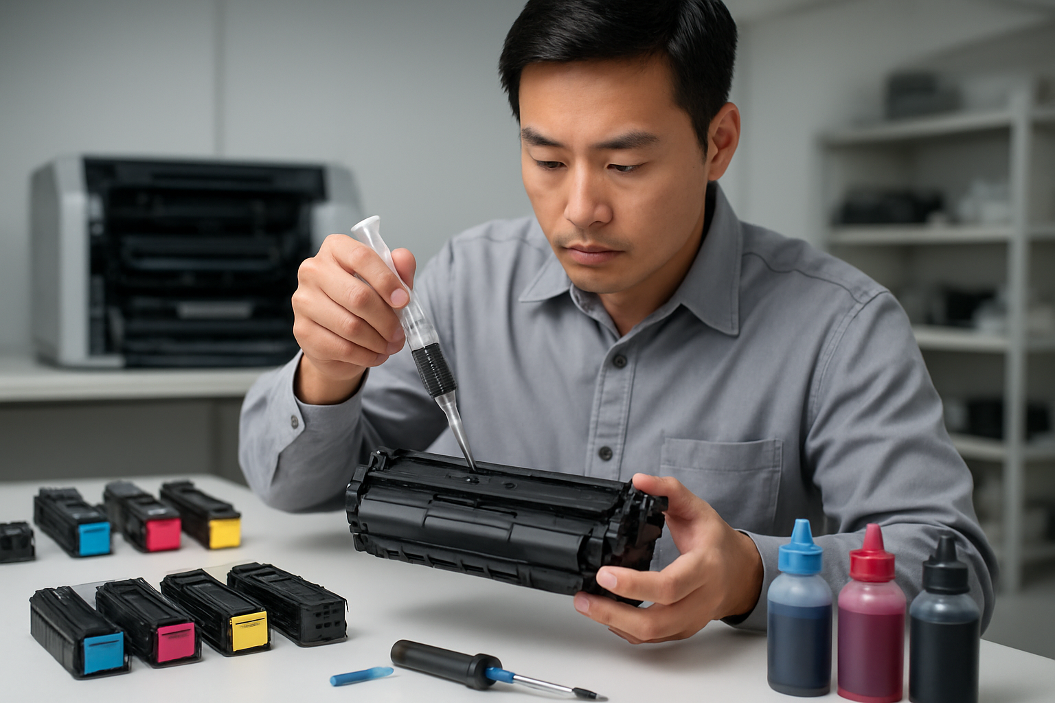 Quy trình đổ mực được thực hiện theo tiêu chuẩn nghiêm ngặt để đảm bảo chất lượng in và tuổi thọ máy. Đầu tiên, kỹ thuật viên sẽ tháo cartridge ra khỏi máy in một cách cẩn thận, tránh làm hỏng các bộ phận nhạy cảm.