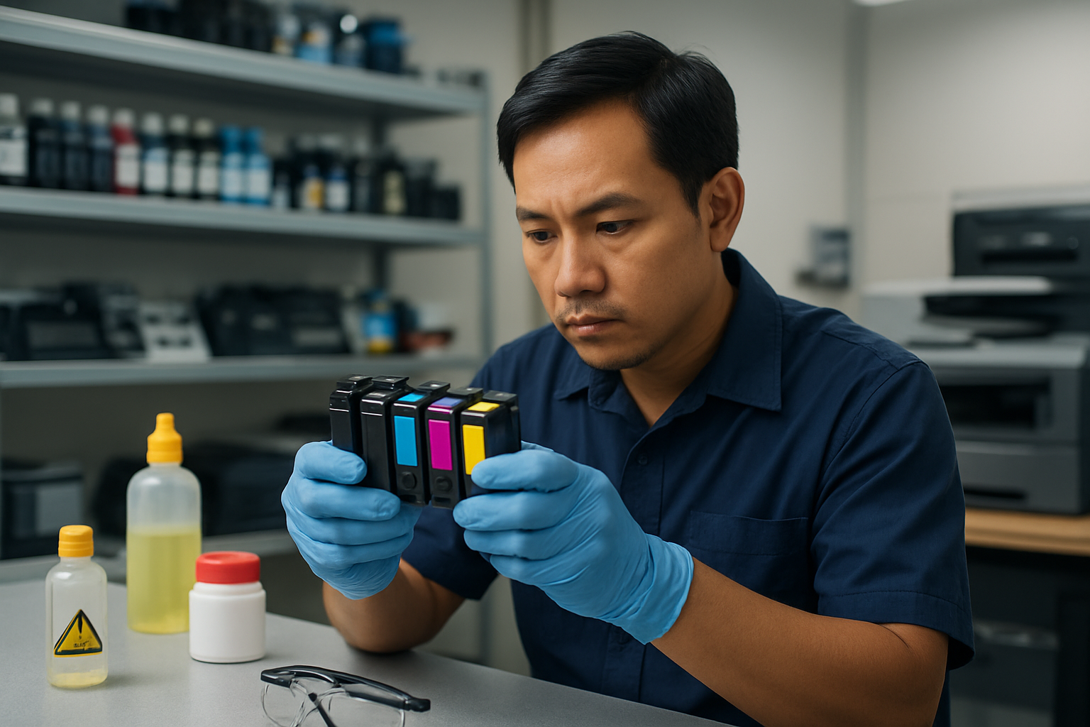 Kỹ thuật viên sẽ kiểm tra tình trạng cartridge cũ, đánh giá mức độ hao mòn của chip và các linh kiện bên trong. Họ cũng kiểm tra đầu phun mực, hệ thống cấp mực và các bộ phận liên quan để đảm bảo máy hoạt động tối ưu sau khi đổ mực.