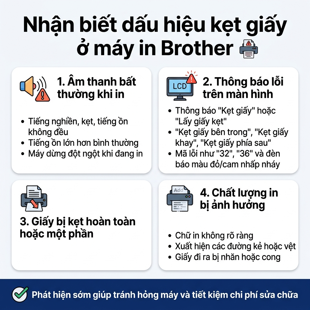 Việc nhận biết sớm những dấu hiệu này giúp bạn xử lý kịp thời, tránh làm hỏng máy in Brother và tiết kiệm chi phí sửa chữa không cần thiết.