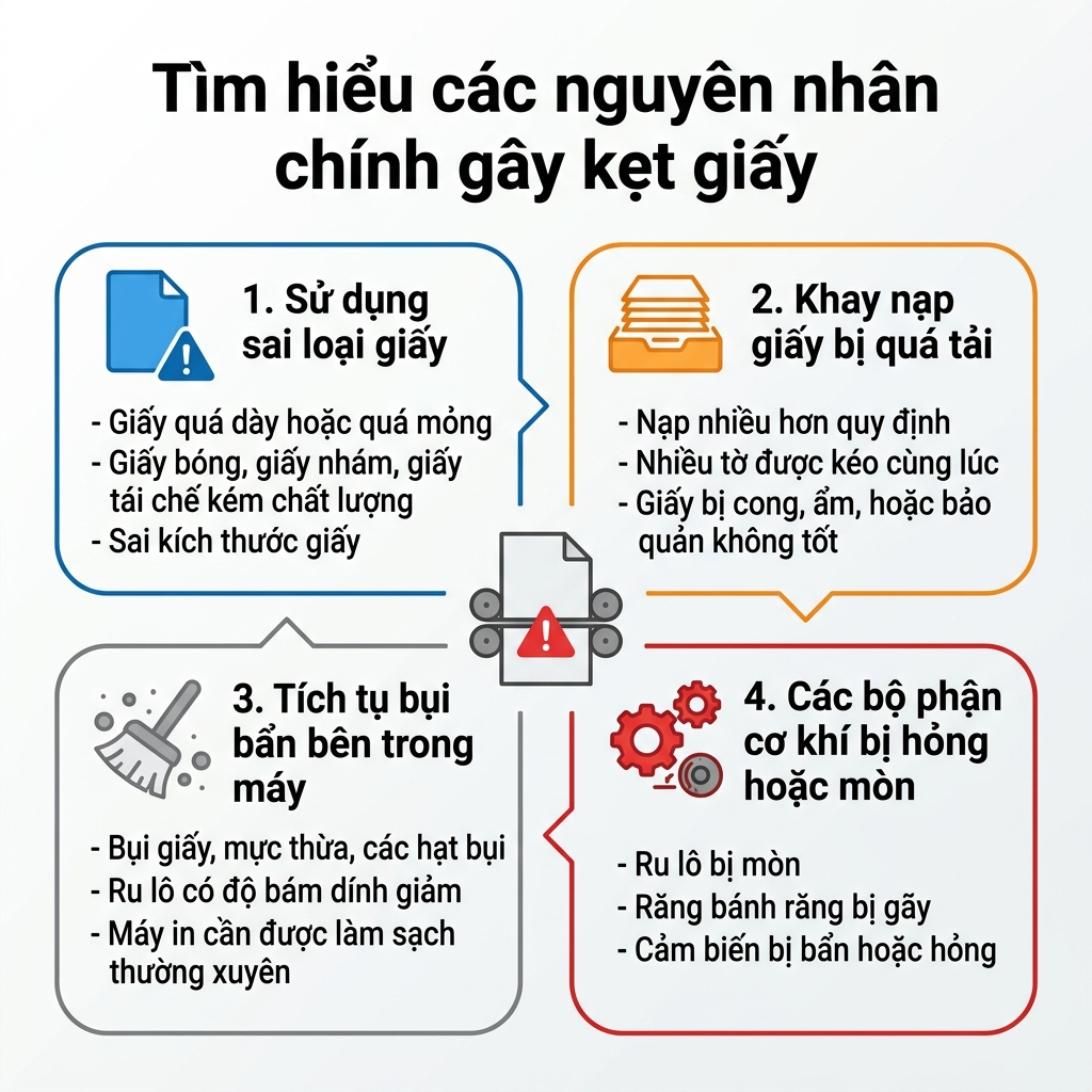 Small body text: "Dấu hiệu kẹt giấy xuất hiện sớm giúp xử lý nhanh và an toàn."