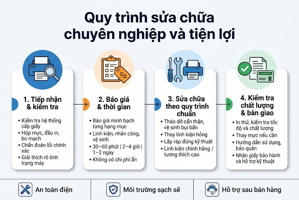 Sau khi hoàn tất việc chẩn đoán, địa chỉ sửa máy in ở Lê Duẩn Hà Nội sẽ cung cấp bảng báo giá minh bạch với từng hạng mục chi tiết. Báo giá bao gồm giá linh kiện thay thế (nếu có), chi phí nhân công và các dịch vụ kèm theo như vệ sinh máy, hiệu chỉnh.