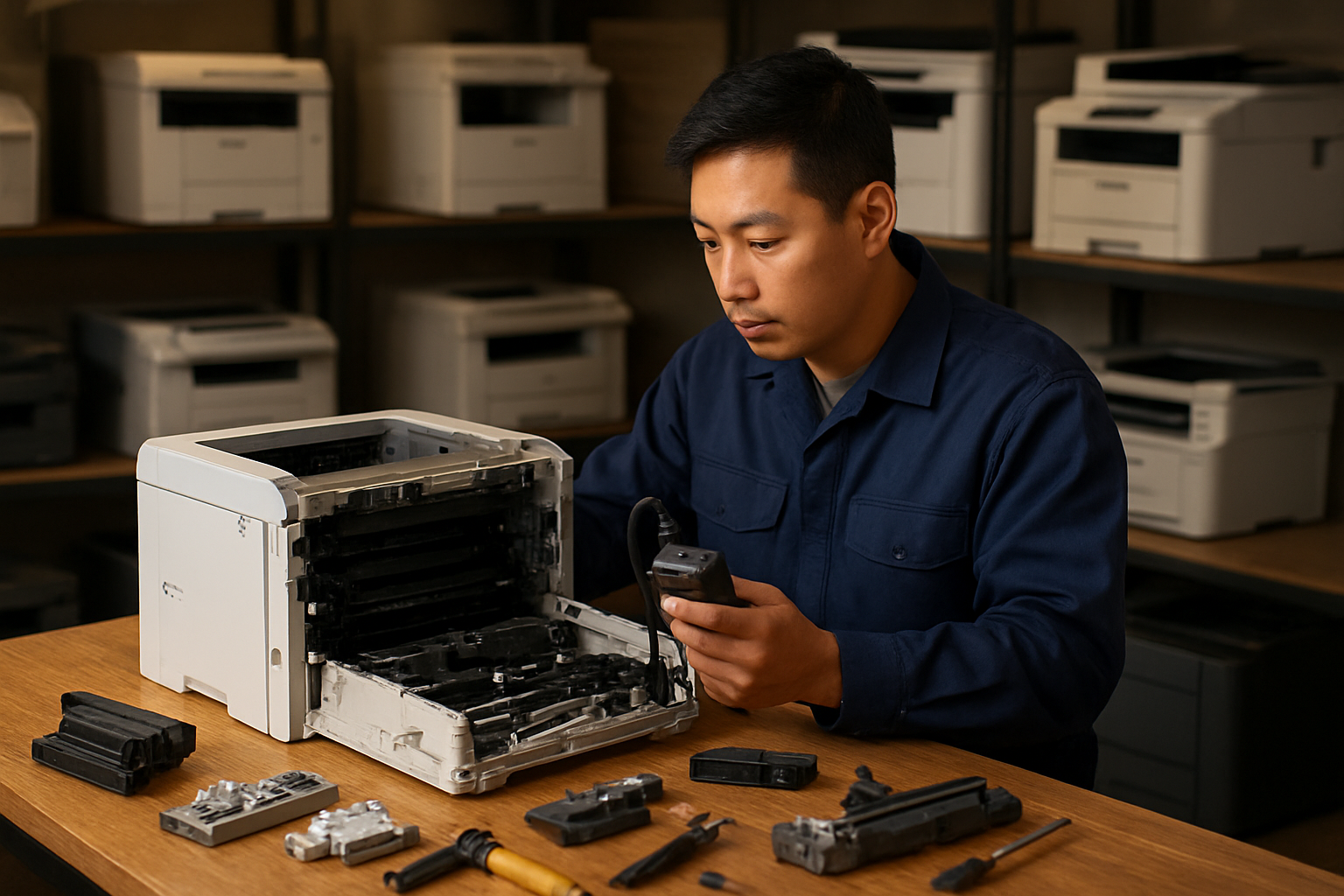 Máy in sửa chữa tại Thanh Nhàn được thực hiện bằng các thiết bị và công cụ chuyên dụng. Kỹ thuật viên sử dụng kính hiển vi để kiểm tra các linh kiện nhỏ. Máy hàn chuyên dụng cho các mạch điện tử và phần mềm chuyên nghiệp để cập nhật firmware.